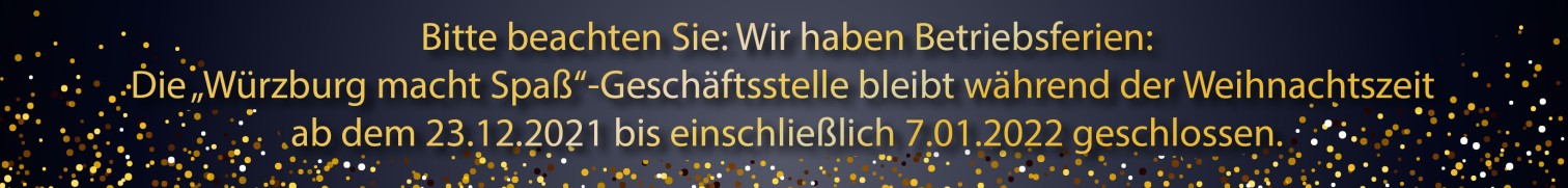 Das Stadtmarketing "Würzburg macht Spaß" nimmt die Corona-Pandemie sehr ernst. Wir tun unser Bestes, um uns, unser Mitarbeiter, Mitglieder und Partner zu schützen. Daher ist unsere Geschäftsstelle aktuell für Publikumsverkehr geschlossen - wir bitten Sie um Verständnis.
