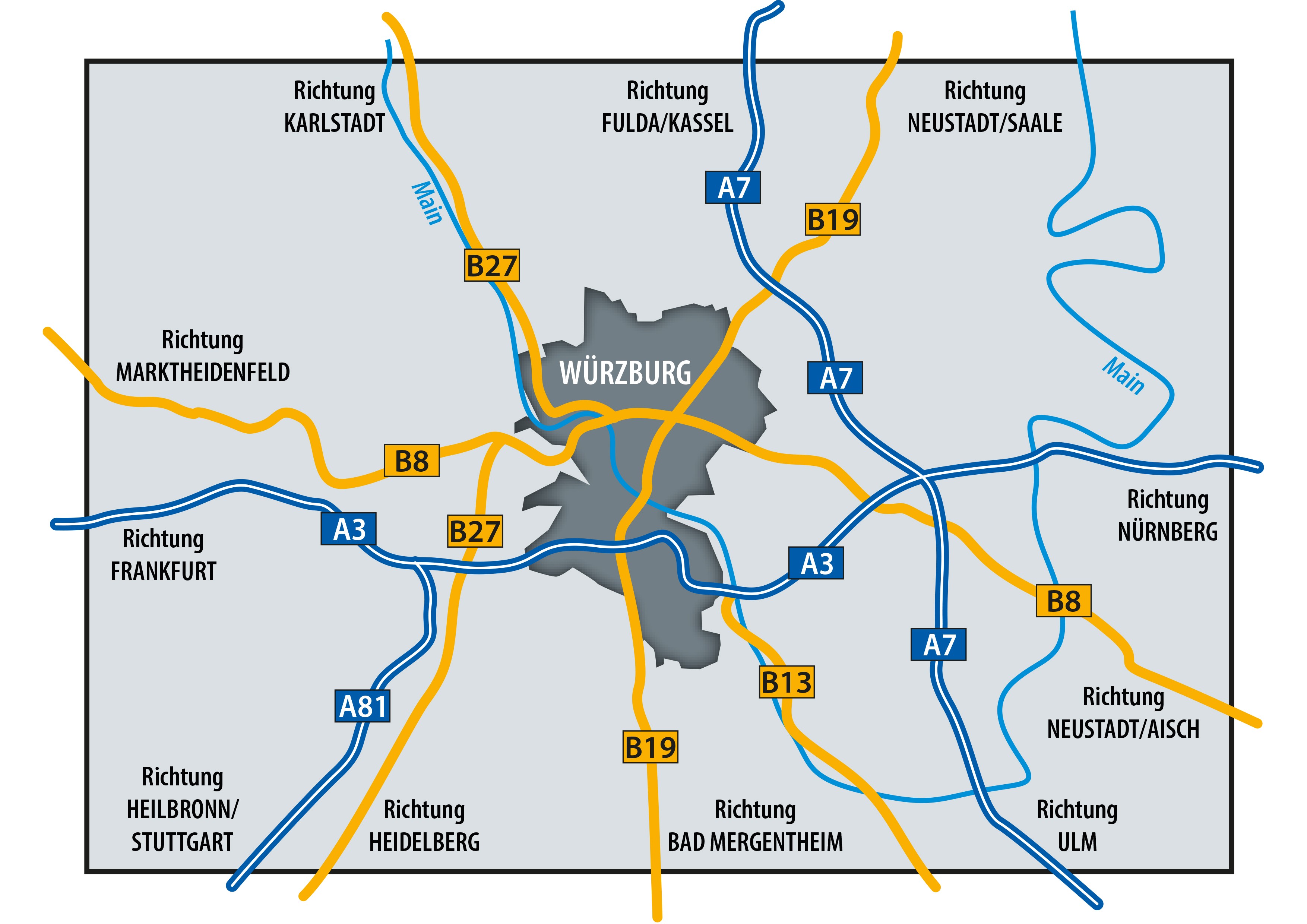 - Fahren Sie bis zum Autobahndreieck Biebelried von dort weiter auf die A3 in Richtung Frankfurt/Würzburg. Bei der Ausfahrt Rottendorf verlassen Sie die Autobahn und biegen auf die B8 in Richtung Würzburg ab. Von da folgen Sie bitte der Beschilderung in Richtung Innenstadt.