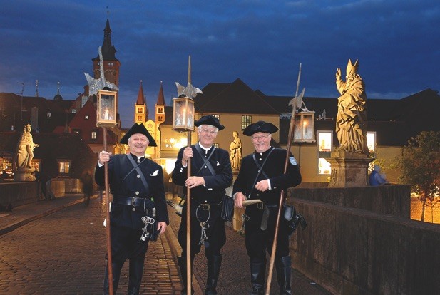 Der Würzburger Nachtwächter ist ein Original der Stadt und begeistert allabendlich Jung und Alt. Im Dämmerlicht, mit Hellebarde und Laterne bestückt, geleitet er die Gäste durch die Gässchen Würzburgs und erzählt allerhand Unglaubliches und Verrücktes aus der Anekdotenwelt der Bischofsstadt.
