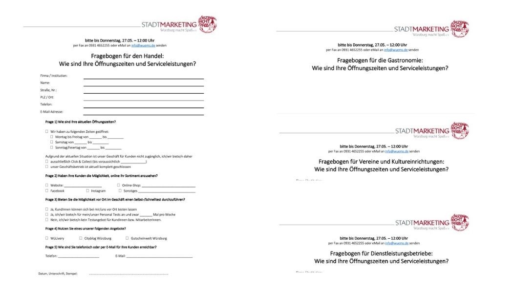 25. Mai 2021Im Beitrag finden Sie noch einmal die Kurzfragebögen, mit denen wir Ihre aktuellen Öffnungszeiten und Erreichbarkeiten erfragen möchten. Wir bitten Sie, sich – soweit noch nicht geschehen – erneut die Zeit zu nehmen und uns die Fragen in dem Ihrer Branche entsprechenden Formular zu beantworten. Wir werden Ihre Antworten wieder sammeln und diese als Gesamtdarstellung auf unserer Website und über unsere Social-Media-Kanäle aktualisiert veröffentlichen. Darüber hinaus werden wir die Informationen auch den lokalen Medien mit der Bitte um Veröffentlichung übermitteln. Wir bitten um Rückmeldung bis spätestens Donnerstag, 27.05.2021, damit wir noch in dieser Woche die Informationen den lokalen Medien übermitteln können.