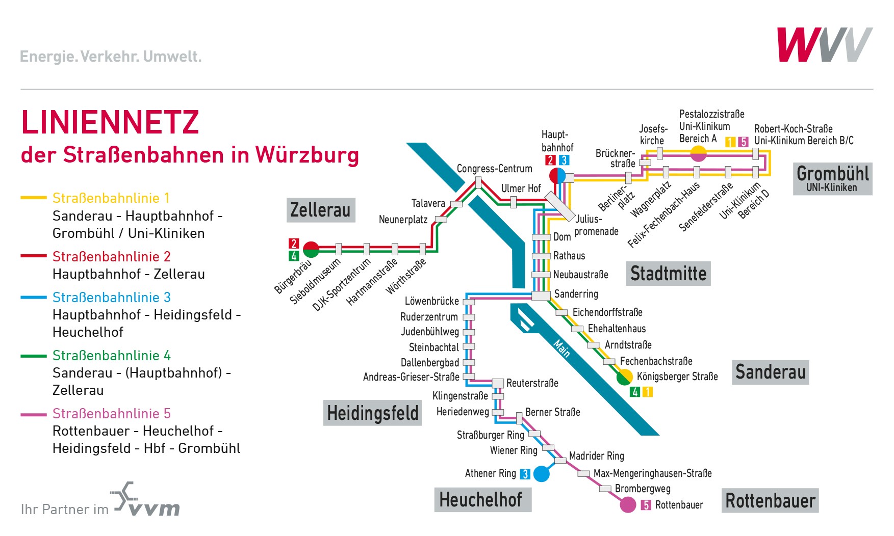 Mit dem öffentlichen Nahverkehr können Sie Würzburg und die umliegenden Gemeinden perfekt erkunden. Ob mit der Straßenbahn (Straba) oder den Bussen der WVV kommen Sie schnell von A nach B.