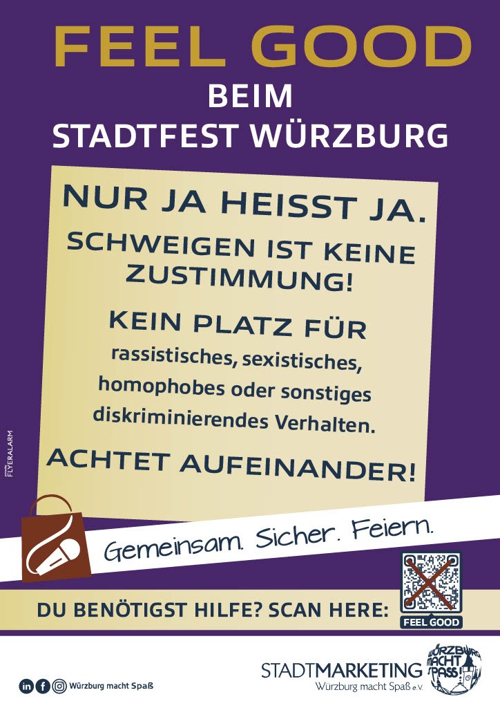 Das Feelgood-Team ist während der gesamten Veranstaltungsdauer an den Bühnen von TV Mainfranken (Eichhornstraße) und der Würzburger Hofbräu (Unterer Marktplatz) stationiert. Sollte es zu einem Notfall kommen oder ihr in einem Konfliktfall Unterstützung benötigen, könnt ihr euch direkt an das Feelgood-Team wenden. Auch alle Mitarbeitenden des Stadtfestes stehen euch zur Seite und können das Feelgood-Team für euch kontaktieren.
