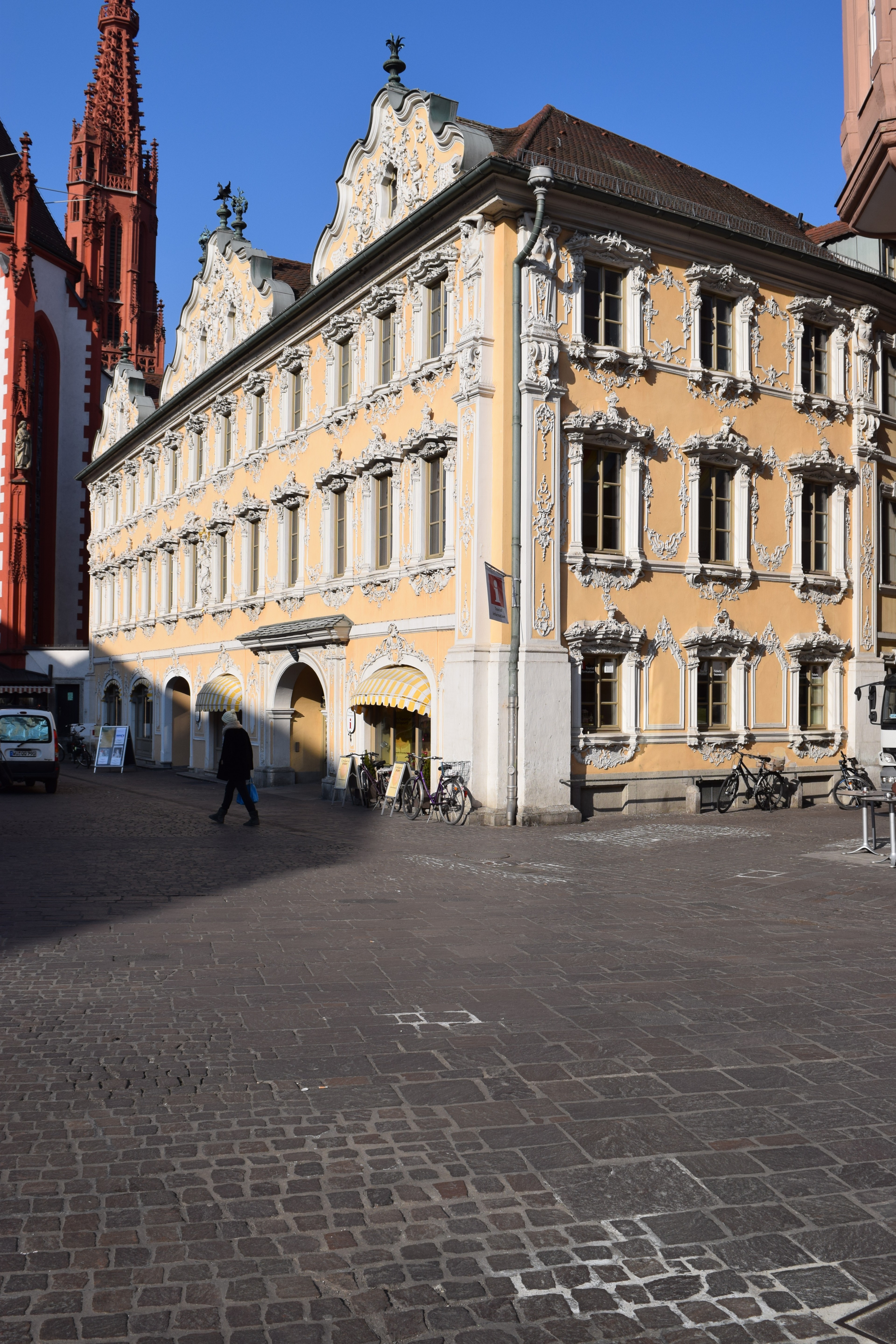 One of the most famous houses in Würzburg is the Falkenhaus, which is located on the north side of the upper market, right next to the choir of the Marienkapelle. The yellow-painted Falkenhaus stands out with its extraordinary stucco decorations of white stucco ornaments. Today the building is used as the city-library of Würzburg and as the tourist information.
