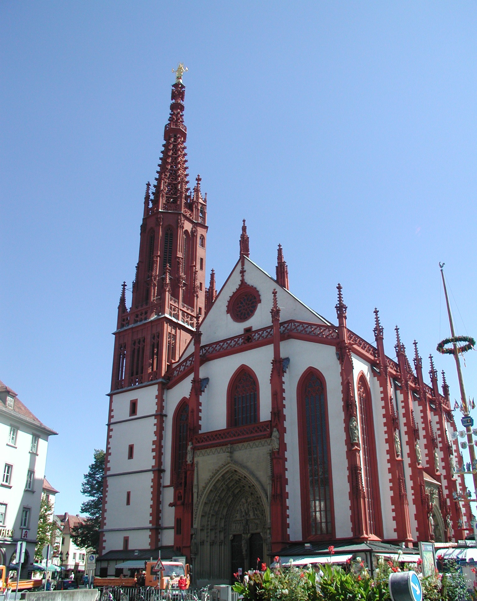 The Marienkapelle is a Roman-Catholic church located at the market square in Würzburg. It was built in the Gothic style in the 14th century. The church was heavily damaged during the Bombing of Würzburg in World War II and the flames destroyed its interior. In the 1950s the church was rebuilt and re-consecrated in 1962. It is best known for the sculptures of Adam and Eve, which were built by Tilman Riemenschneider.