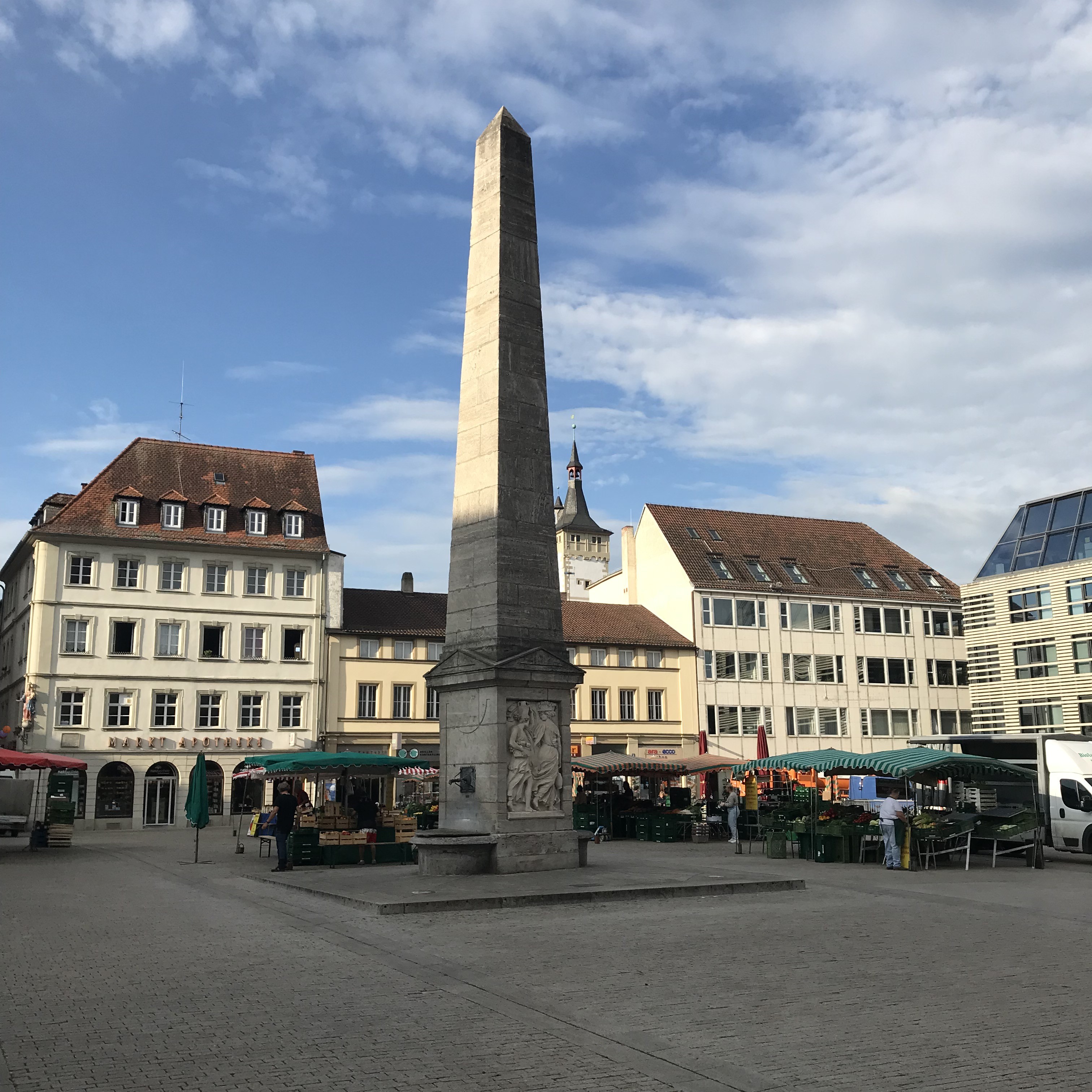 The market fountain represents an obelisk and was built in 1808 by J.A. Gärtner. The reliefs are based on ancient models and were designed by Martin Wagner the son of Peter Wagner. The obelisk on the market reminds of the Napoleonic period under Ferdiand of Tuscany. Around the fountain, there is a lively market with various events throughout the year such as the Killianimesse, the All Saints' Day Mass and the Christmas market.