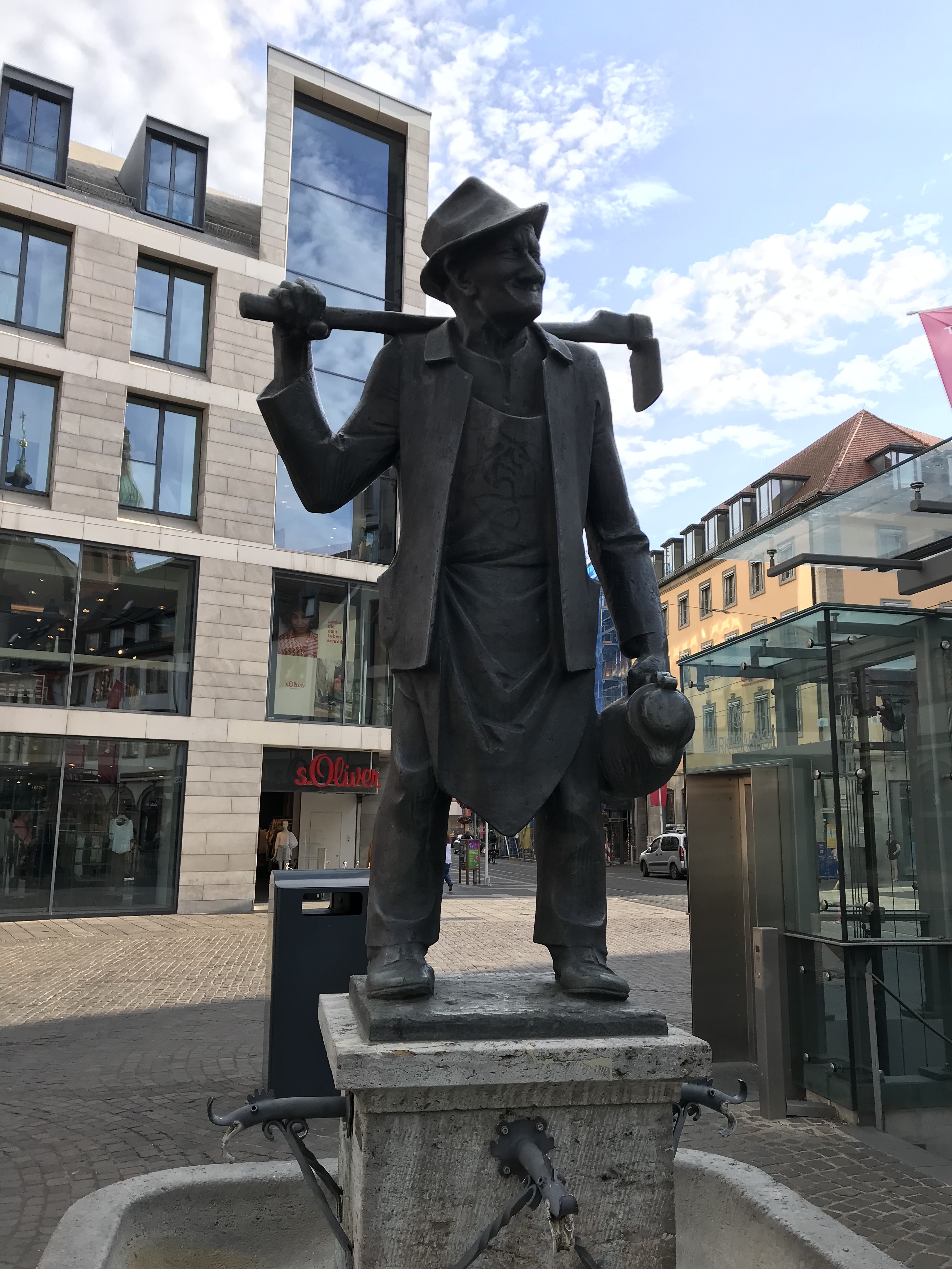 On the 200th Anniversary of the Seisser Department Store in 1973, the owner Günther Seisser donated 35.000 DM to the city for a fountain in the area of his former office. The Häckerbrunnen was designed and built by Richard Rother. It took four years until the fountain was unveiled in its current location in 1977.